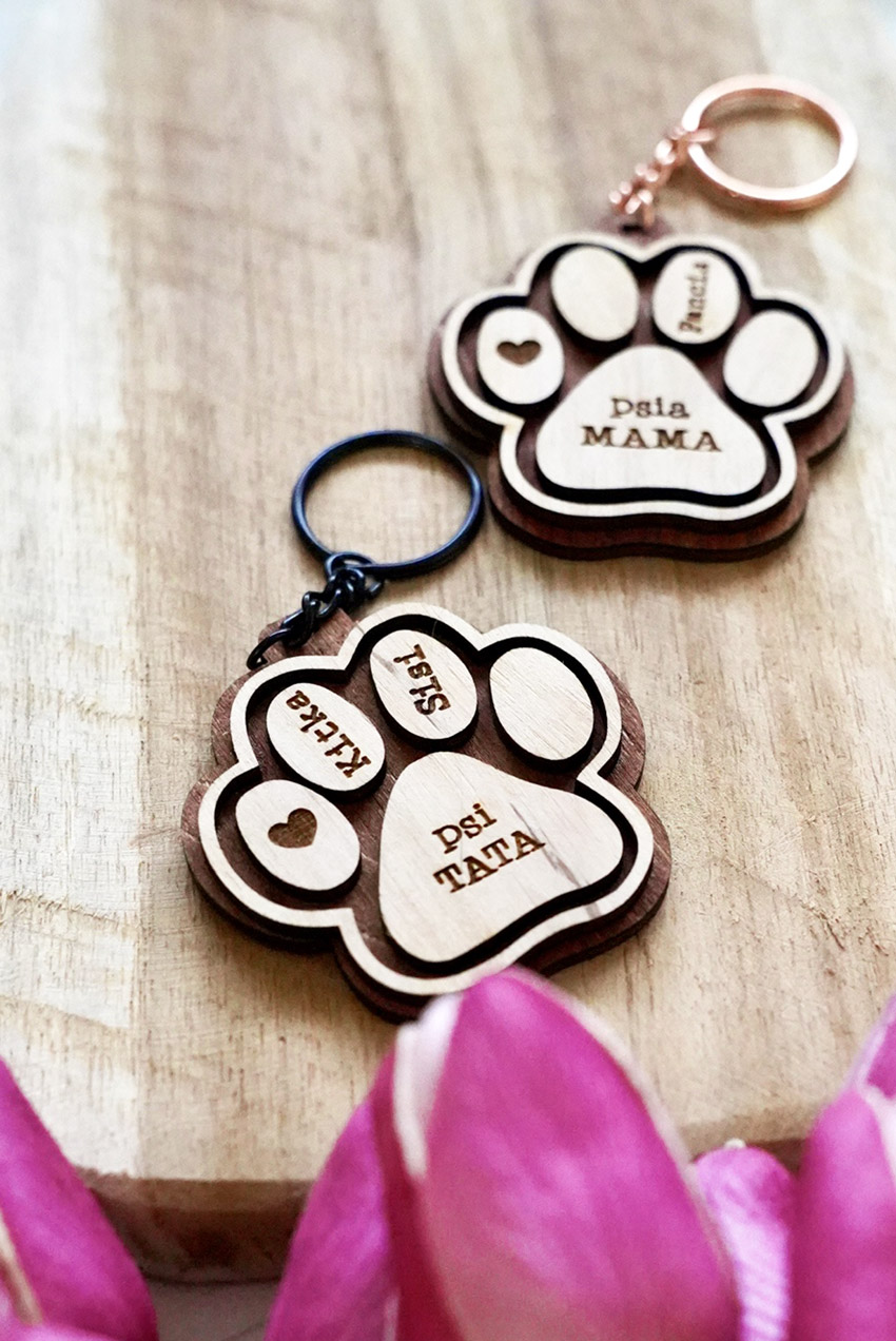 Personalizowany breloczek w kształcie psiej łapki to idealny prezent dla każdego miłośnika czworonogów. Wykonany z ręcznie malowanej sklejki o grubości 6 mm, z grawerowanym napisem „psia MAMA” lub „psi TATA” oraz imionami pupili. Lekki, trwały i pełen uroku – będzie pięknym dodatkiem do kluczy lub plecaka.