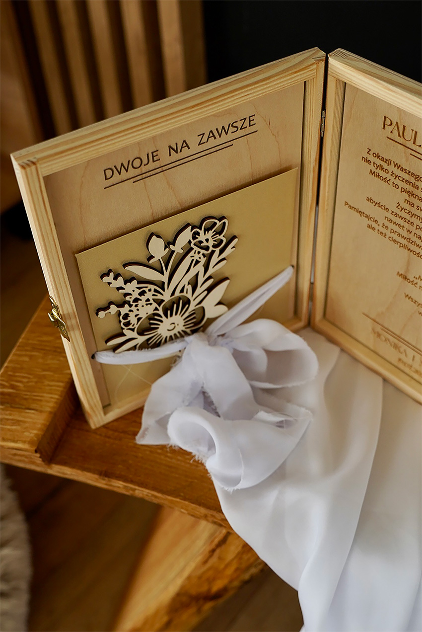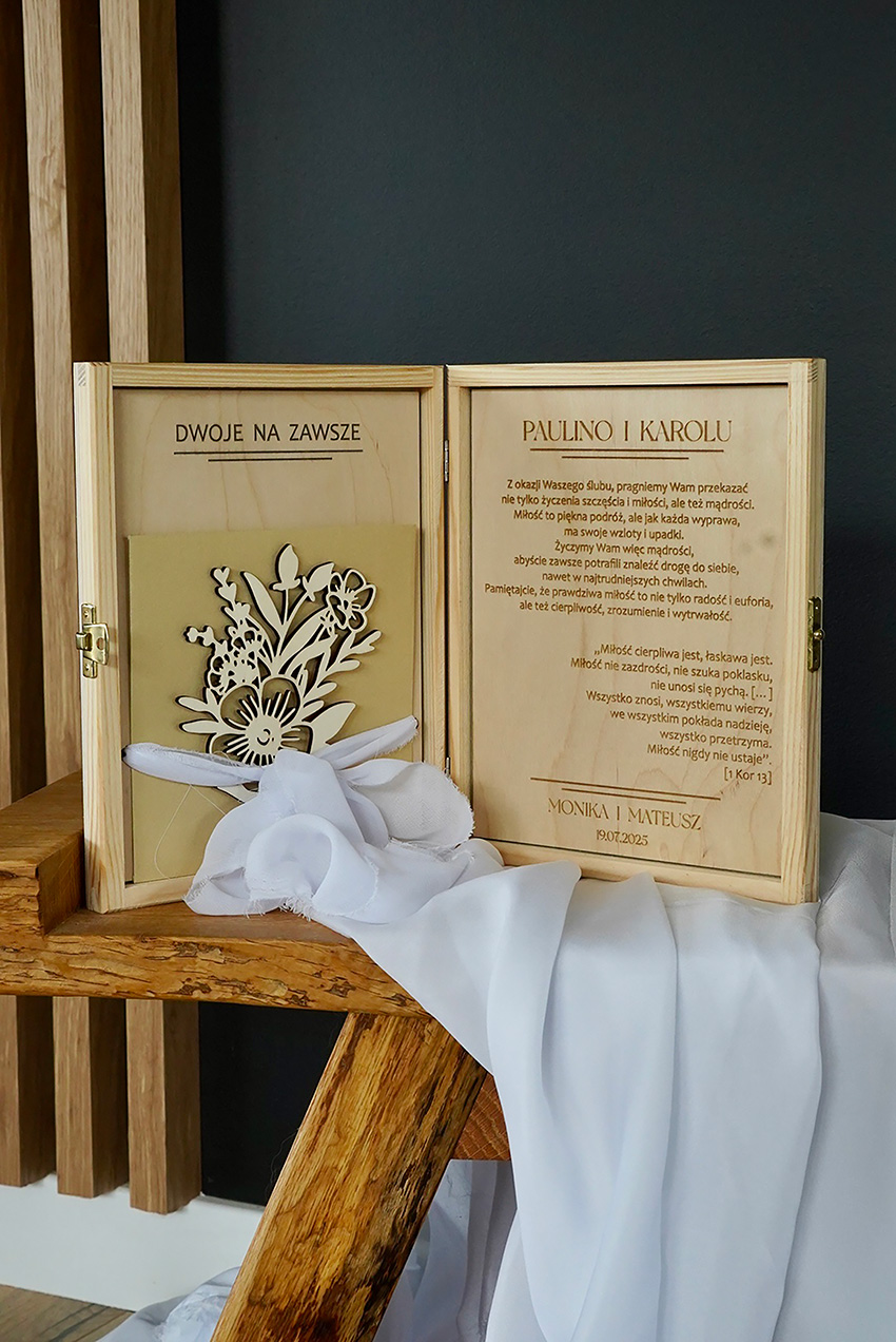 Wykonana z naturalnego drewna, z delikatnym grawerem i kopertą ozdobioną ażurowym bukietem – będzie piękną pamiątką na całe życie.