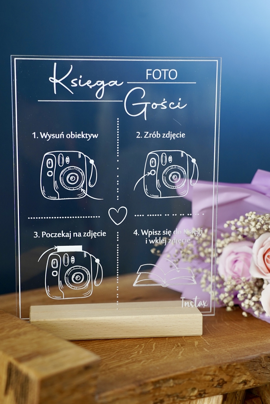 Przejrzysta, minimalistyczna tabliczka wykonana z przezroczystej plexi, która w prosty i estetyczny sposób pokazuje gościom, jak dodać zdjęcie z Instaxa do księgi pamiątkowej.