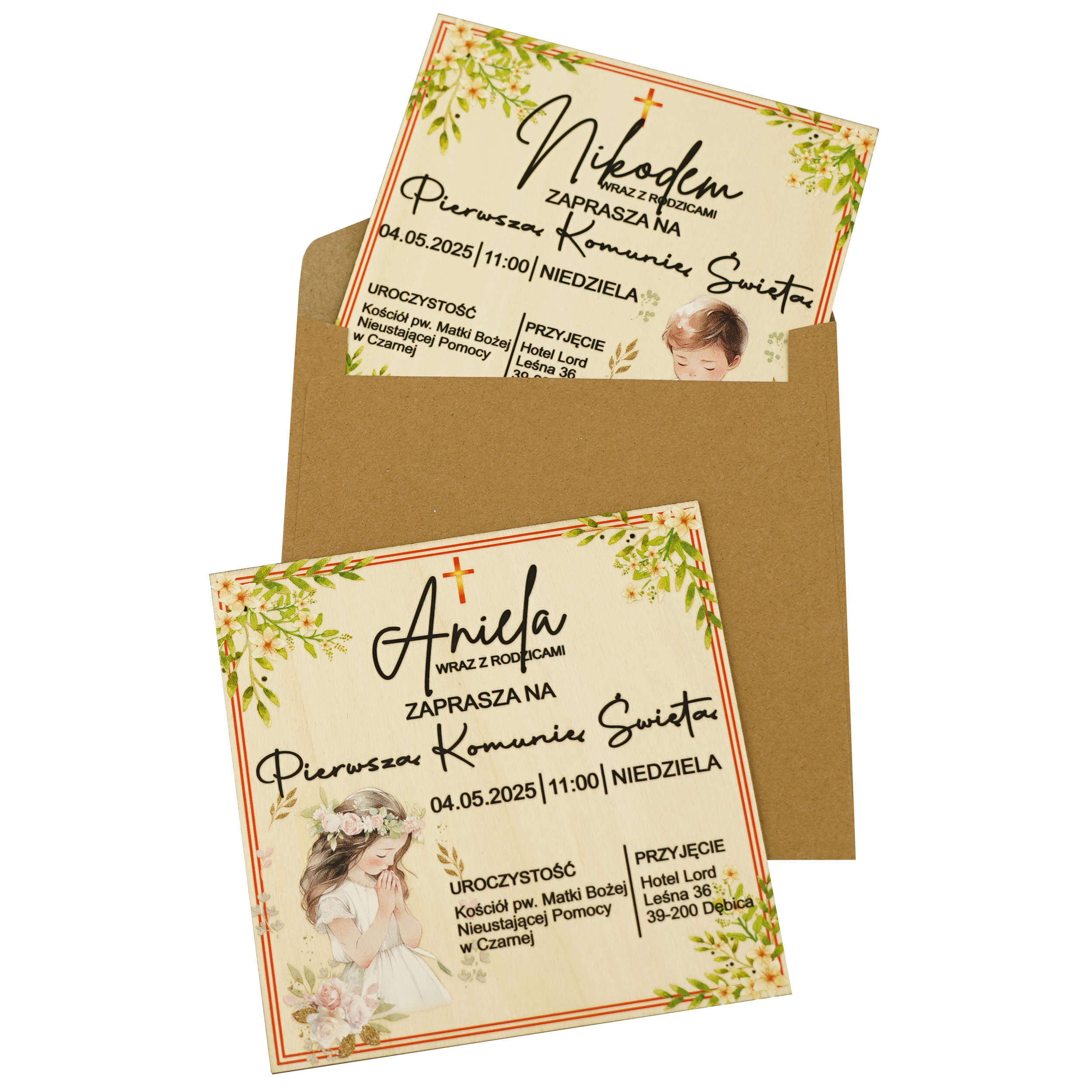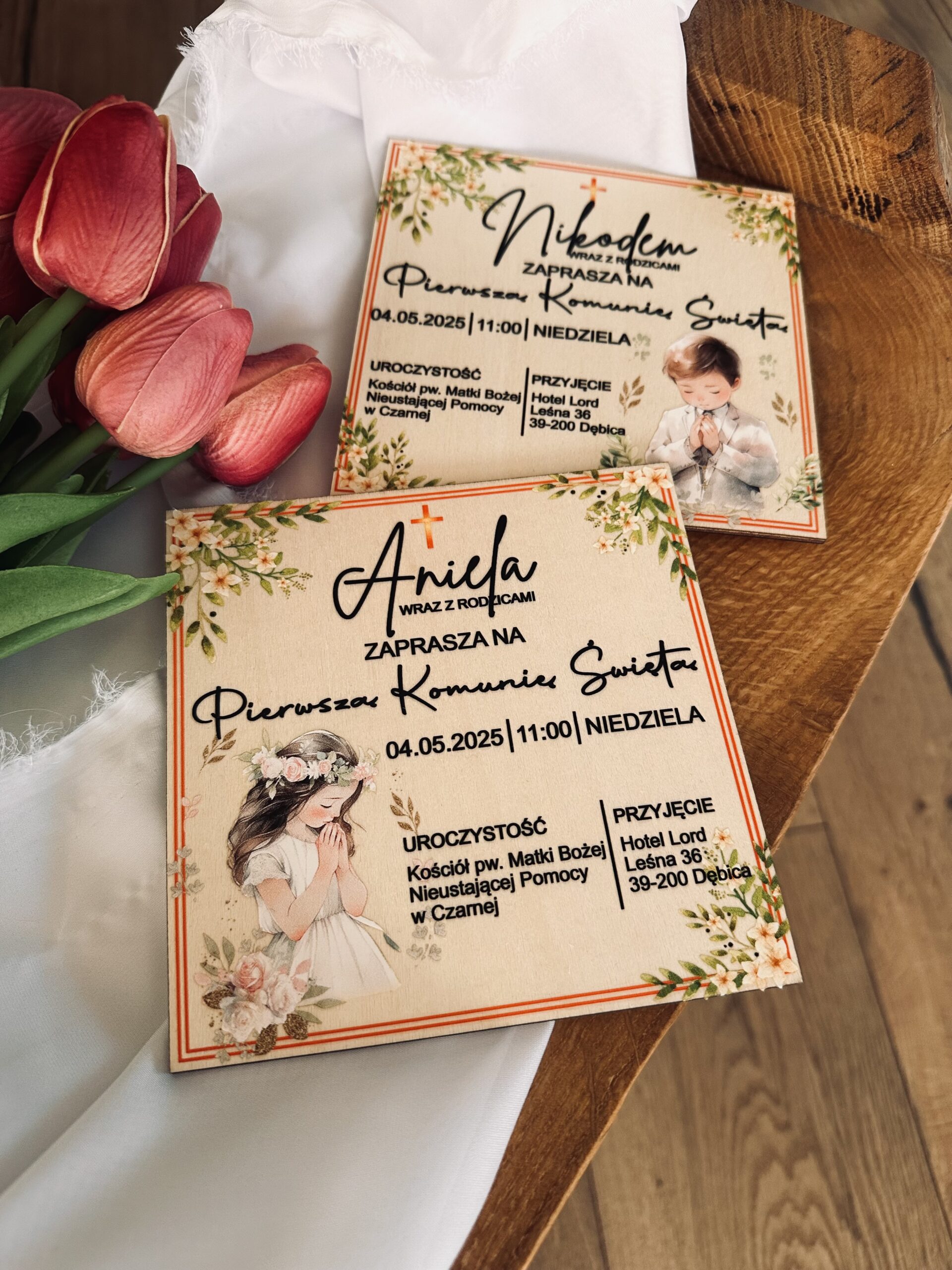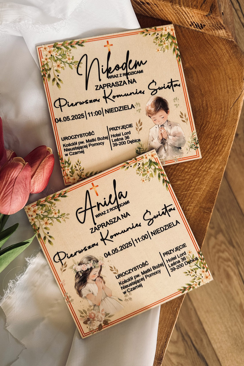 Drewniane zaproszenie na Pierwszą Komunię Świętą wykonane z naturalnej sklejki o grubości 3 mm, o wymiarach 14 × 14 cm. Delikatna, akwarelowa grafika i personalizowane dane tworzą harmonijną, elegancką całość. Każde zaproszenie wykańczane jest z troską o najmniejszy szczegół.